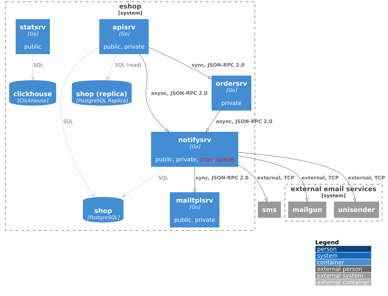 Public API— есть публичное API.Private API— есть приватное API.Brokersrv Queue— принимает сообщения через brokersrv (NATS JetStream).Cron— есть периодические задачи.